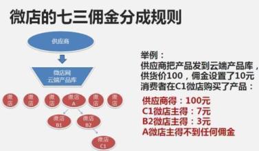 三级分销,也即品牌商可以发展三级分销商,每一级分销商均可以往下再发展两级分销商。两类佣金,也即店铺产品销售佣金与店铺推广佣金。
