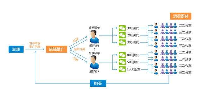 微信三级分销就是在帮助企业搭建专属的微商城基础上,通过微信分销系统,让每个品牌的买家都可以申请成为分销商,他们获得专属二维码,并分享二维码到朋友圈等社交网络媒体上,通过朋友圈熟人关系链实现裂变式口碑传播。分销商无需囤货,也不需要再重复的上架商品,更不用任何代理费用,加入门槛低,见效快。对于传统企业而言,不但解决了推广问题,发展“粉丝经济”,还能将多种渠道的客户汇聚到同一平台,帮助企业形成自己的大数据库,并统一管理。