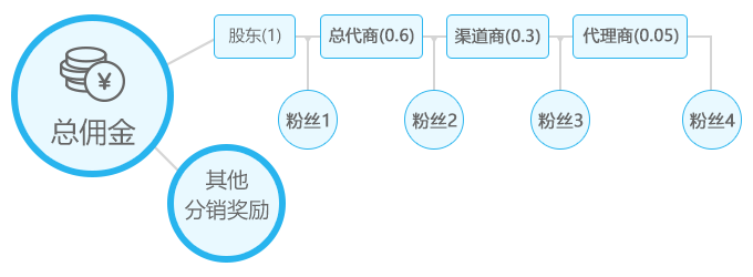 1.等级划分:一次划分为4个等级:代理商——渠道商——总代商——股东。