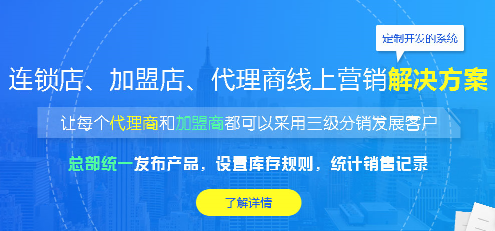 连锁店,加盟店,代理商线上营销解决方案,让每个代理商和加盟商都可以采用三级分销发展客户,总部统一发布产品,设置库存规则,统计销售记录。