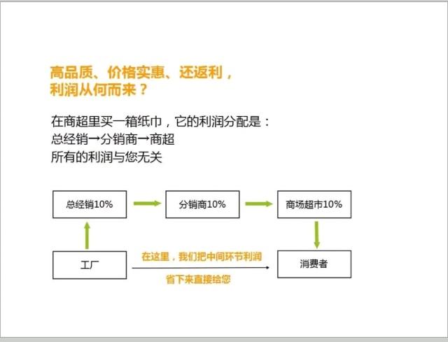 传统的分销模式是:工厂—总经销—分销商—商城超市—消费者,所有的这个利润跟消费者没有任何关系,而“我的天然工坊”确把这种模式进行了颠覆,让消费花钱的同时也能赚钱,就是把总经销、分销商、商场超市的这部分利润分给消费者。