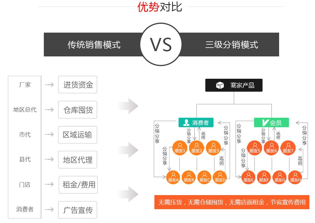 三级分销系统是主要是以三级分销模式为主,强调三级。而传统分销系统主要是分销模式,两级也有三级也有。分销系统因主打无限三级分销循环裂变分销模式,受到欢迎。原因在于它打破的分销模式级数的限制,循环裂变,瞬间建立分销体系,抢占移动市场。
