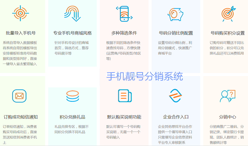 手机靓号分销系统,手机号分销系统怎么做?手机连号,吉祥号,靓号,炸弹号挑选商城,基于三级分销模式,返还佣金的方式分销代理。专门为售卖手机号定制开发线上分销系统,打破传统普通商城销售限制,快速实现全网营销(PC端+手机端+微信端+APP)。