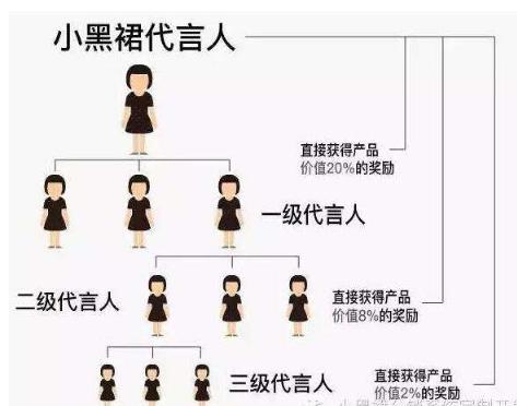 1.小黑裙三级分销模式与众不同之处在于是其采用的微分销模式。消费者只需要成功购买一件小黑裙,系统将自动生成拥有个人专属的二维码,即可成为小黑裙的代言人。