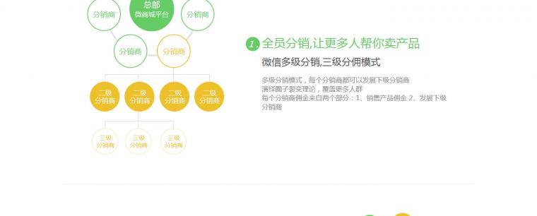 一套系统,总部只管提供产品和系统平台,分销商0成本加入,无囤货,只负责线上提交订单,售后和物流服务总部一键管理。打造立体分销商业网络帝国,把客户,好友,粉丝快速转化为分销商,病毒式传播,引爆社交关系链,裂变式发展微店分销商,一店变多店,最快速度拥有最广泛的社交分销渠道。