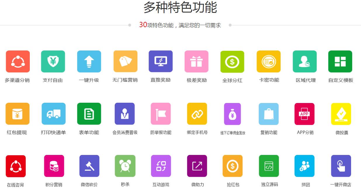 分销微商城系统核心功能38项,有企业版、B2C、B2B2C、多商家多门店、020、行业性等几十套商城系统(包含年版和源码形式)。因此分销微商城具体收费也是按企业商家自己的需求选择版本价格的;