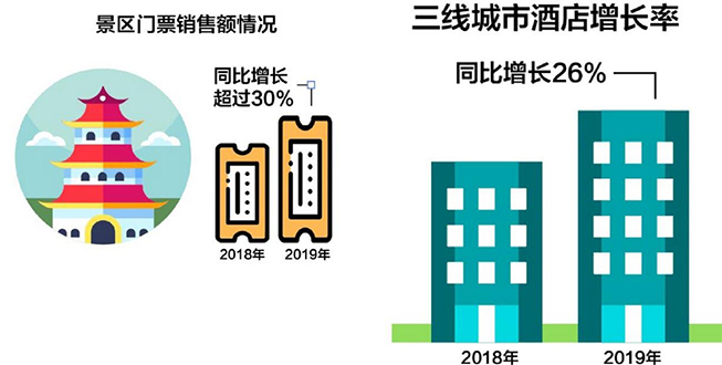来自美团点评的数据显示,2019年春节期间旅游人气高涨,境内主要景区的门票销售额同比增长超过30%。在交通中转、探亲访友、出门旅游等需求带动下,“春节返乡住酒店”成为热潮。美团点评监测发现,常驻一二线城市的用户中,春节期间预订三线及以下酒店的占比较平日涨幅高达26%。