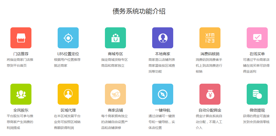 债务抵用商城消费系统是什么意思?还债系统是如何运营的?收取债主的欠条,别要不来的债务你来要,为债主在商城充值相应的积分,债主可以用积分+现金的方式消费购买自己需求的商品,弥补了债务上的亏损。
