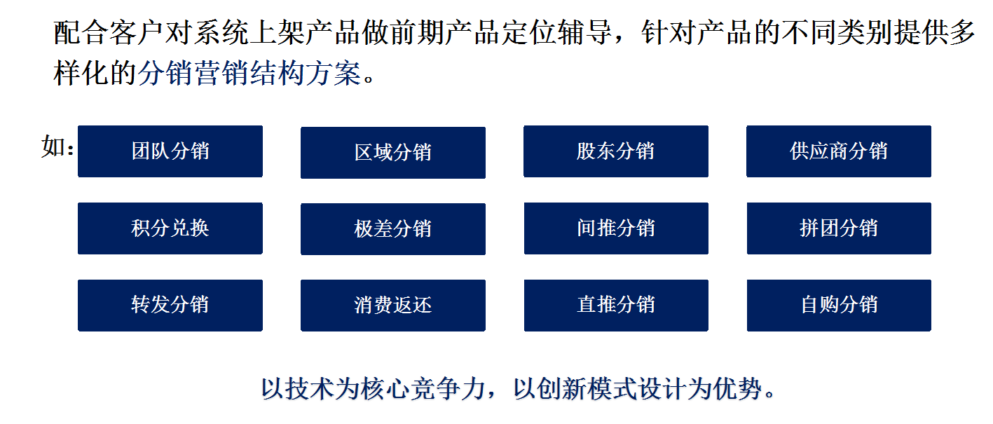 分销系统最大的优点就是宣传快;自媒体运营:百家号、企鹅号、头条号、大风号、搜狐号、一点号等10家媒体;短视频运营:抖音号打造、快手号打造、西瓜视频号打造、头条视频号打造;电商运营:拼多多操盘运营、淘宝操盘运营、天猫操盘运营、京东操盘运营。迅速提升了商城的知名度、塑造企业品牌。