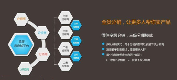 微信商城中加入的分销功能,通过返佣机制,把利润让给客户,更加刺激了客户的消费,同时能够通过自己客户的介绍,无限的发展更多的客户群体,不但锁住了原有客户,同时在现有的基础上多了更多的宣传员,引流的更大的客户群体。