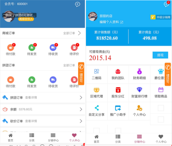 五、分销中心:参与分销,支持用户根据专题参与分销,从分销的链接注册成为会员将成为其下级,下级会员购买产品获得相应提成;分销商;支持查看每个会员邀请的分销商名单;佣金,支持用户查看已结佣金、未结佣金、用户佣金提现;推广,支持用户分销推广订单、查看推广点击名单、查看成功关注名单
