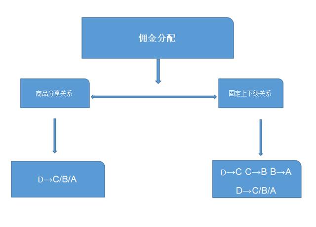 (D是C的下级、C是B的下级、B是A的下级、D无论购买谁转发出的商品,C/B/A都将获得佣金)