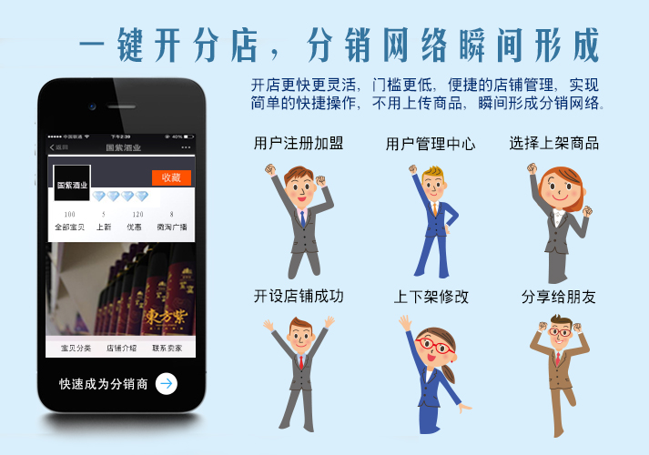 连锁招商加盟分销系统针对连锁机构,招商加盟企业的涵盖着分销模式的平台,覆盖多家连锁系统,加盟商入驻。企业统一有序管理下级和产品,线上发令快捷方便,招募下级分销商动员更多人帮您挣钱。