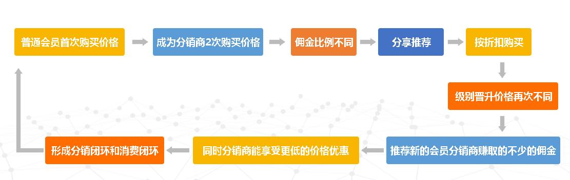 若D为普通会员,佣金比例为10%,C的佣金为100*10%*10%=1元,B的佣金为100*10%*20%=2,A的佣金为100*10%*30%=3元。